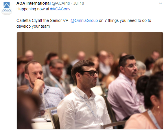 Greg Leaf, shown to the left in blue, in this image tweeted by ACA International during the conference.